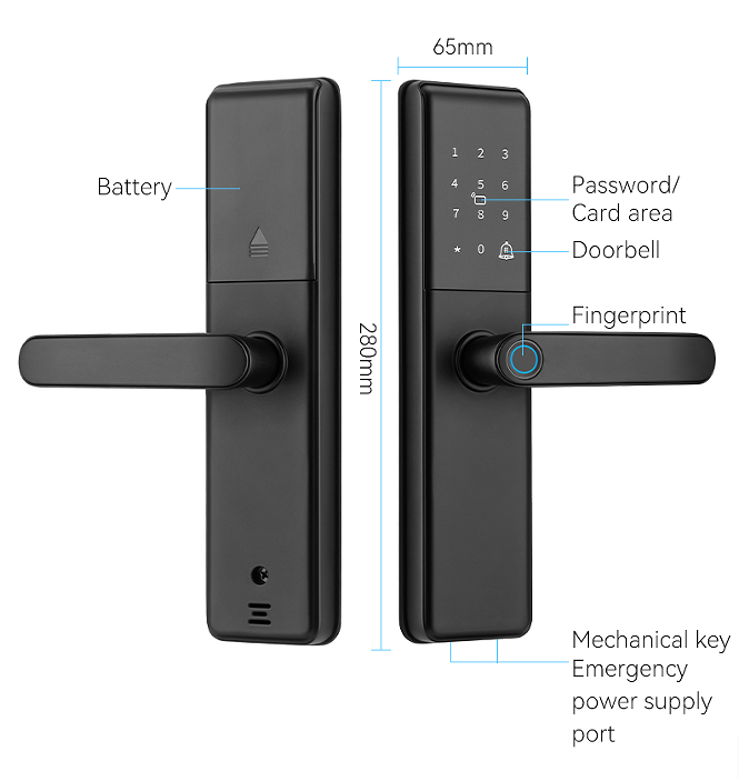 | Camino de desbloqueo: | Aplicación Tuya wifi/aplicación TTlock, contraseña, huella digital, tarjeta y llave | Aplicación: | Tuya Smart / TT bloqueo |