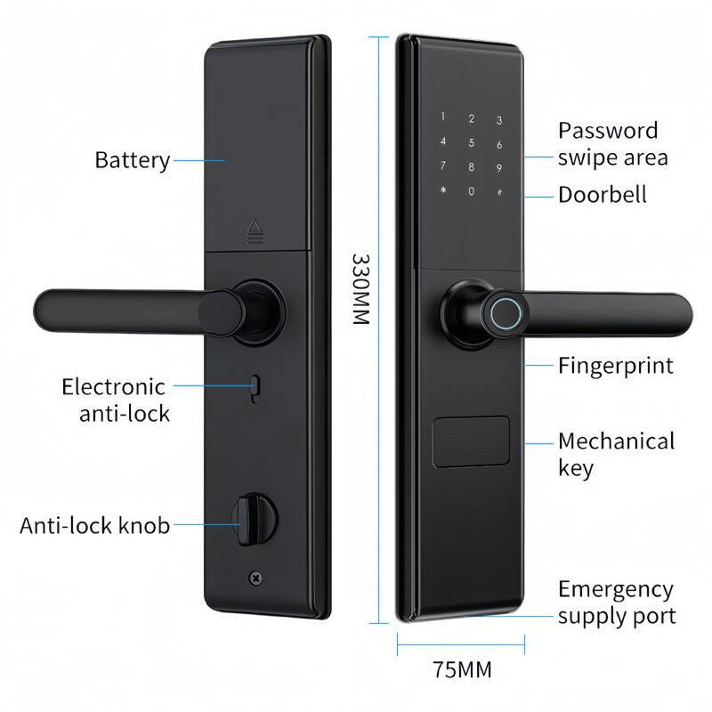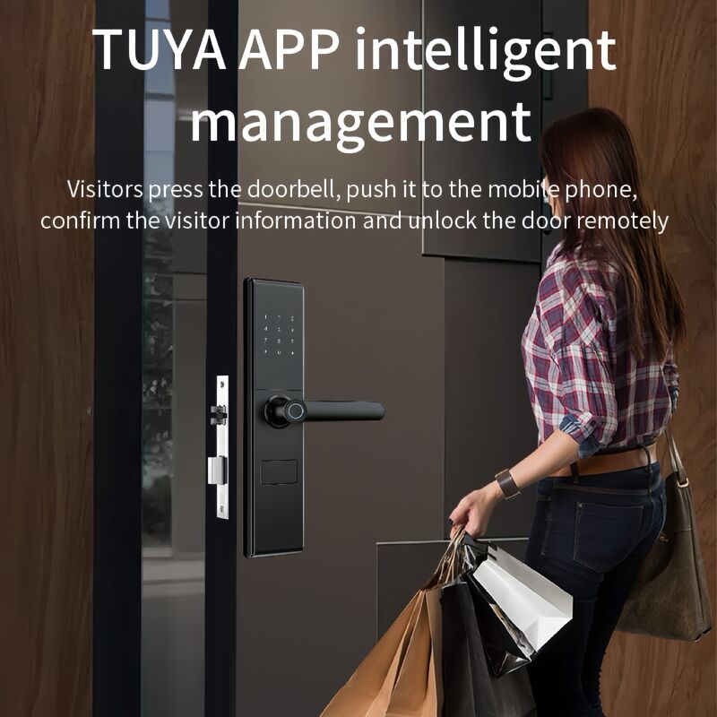 * Opciones de desbloqueo múltiples Soporta huella dactilar, contraseña, tarjeta clave, llave mecánica y control remoto de la aplicación Tuya.