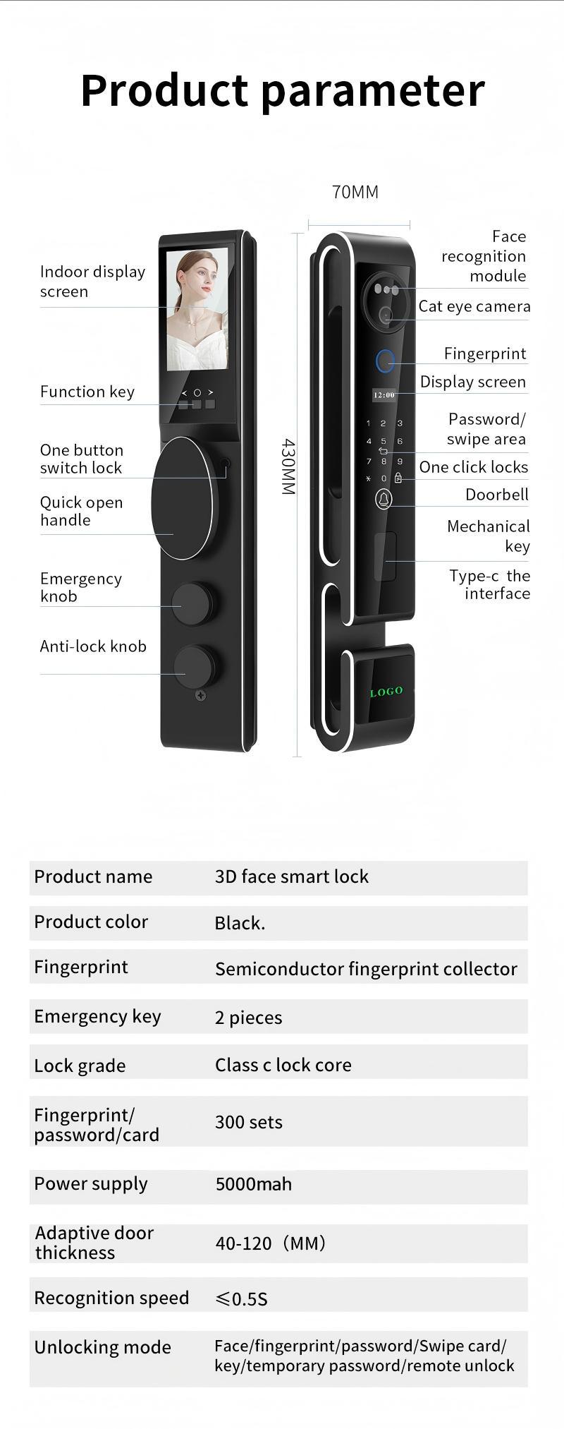 | Resaltar: | Cerradura de puerta inteligente 3D totalmente automática,Métodos de desbloqueo múltiple,Apoyo al idioma de bloqueo digital de puerta |