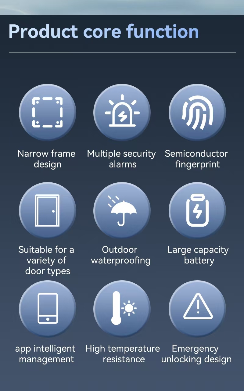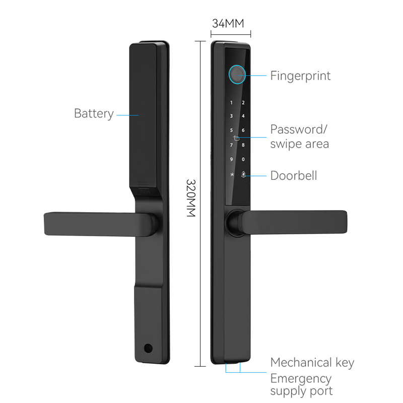 Mejore la seguridad y la comodidad de su hogar con nuestra cerradura digital para puerta IP65 a prueba de agua, integrada con los ecosistemas inteligentes Tuya y TTlock. Esta cerradura inteligente todo en uno combina una protección robusta, métodos de desbloqueo versátiles y conectividad inteligente, ideal para hogares modernos, oficinas y escenarios semi-exteriores como villas. Fabricada en aluminio anodizado de alta calidad, cuenta con un diseño elegante y un rendimiento fiable en entornos hostiles.